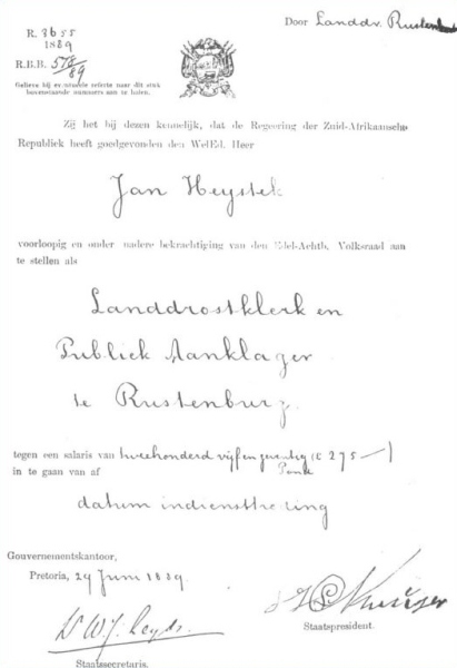 Mij werd aangeboden het klerkschap op zijn kantoor, omdat de plaats daar open was en tijdelijk door iemand anders opgevuld was. Ik vroeg uitstel voor 14 dagen er over te denken. In die tijd was mijn oudste dochter gehuwd, en ook had ik een ongetrouwde zwager Stef. Petrus Erasmus bij mij in huis sedert de dood zijner ouders. Na overleg met de familie nam ik de post aan, niettegenstaande de President er tegen was dat ik bedankt had bij de Commissaris, die zei hij zonder mijnheer Heijstek niet zou klaarkomen. Doch Generaal Joubert deed de schaal overslaan in den Uitvoerende Raad door te zeggen, “Heijstek alleen heeft de post verdiend, en moet aangesteld worden”. De lezer verschone mij dat ik dit hier meldt, en tot eer van wijlen de Generaal dit aanhaal.