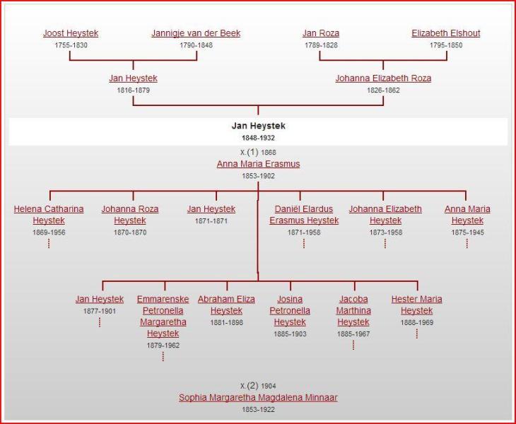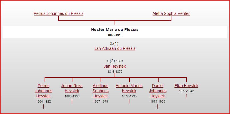 Op de aanliggende plaats Doornpoort woonde Jacobus Wezel die met een weduwe Schoombe gehuwd was en een zoontje van een jaar of zeven had van haar eerste man. Deze werden ziek en stierven allen. Ook van anderen om ons stierven er heel wat. De enige die van ons de begrafenis mijns schoonvaders van ons op de plaats kon bijwonen was zijn zoon Jacobus. De buren die nog gezond gebleven waren begroeven hem. Wat we toen doorgestaan hebben is mij onmogelijk in zijn geheel te beschrijven. Toen we later in zo ver beter waren dat we niet behulp van volk ons weer konden helpen, namen Jacobus en Johannes liet vee en pasten dat op tot in september of oktober toen het op de plaats terug kwam en de gehele boedel per publieke vendutie verkocht werd, en waar de plaats door mijn oudste broeder Joost Heijstek (I3880) werd ingekocht. Ik had in die tijd een stuk grond groot 78 morgen van de plaats Olivenboom direct aan Klipfontein gekocht met plan er later op te bouwen en te wonen. Doch daar mijn broeder zelf plan had op Klipfontein te wonen ging ik eerst tijdelijk naar de plaats Wijdhoek in Pilansberg bij de Malans, beiden ooms van mijn vrouw een school opzetten. Mijn broeder was niet te lang op de plaats toen hij met vrouw ziek werd en zij stierf. Hij werd na haar begrafenis teruggebracht naar Sterkstroom waar hij ook een woning had. Toen hij beter was bracht hij onze eigen vader met zijn vrouw (toen mijn vaders tweede vrouw) en kinderen op de plaats en in maart werd vader ziek aan de malariakoorts en stierf na zeven dagen. Ik was gegaan om hem op te passen en kon hem als kind van hem begraven. Dat was de 16e maart 1879. Hij had de ouderdom van 63 jaren, 2 maanden en 9 dagen bereikt.