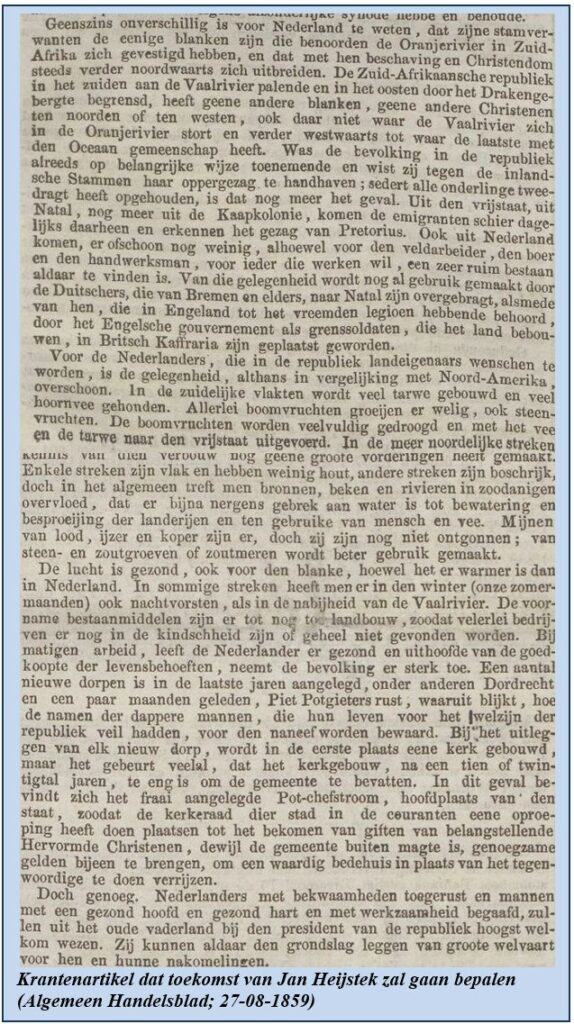 Jan Heijstek hield nauwkeurig bij wat er elders in de wereld gebeurde. Een artikel in het Algemeen Handelsblad van 27 augustus 1859 hield hem al langere tijd bezig en had hem tot nadenken aangezet. Deze redactionele bijdrage interpreteerde hij als een oproep aan agrariërs die landeigenaar in Transvaal willen worden. Hij leest de grote voordelen van een streek waar vruchtbomen welig groeien en tarwe oogsten aanzienlijk zijn. Voor veldarbeiders, boeren en handswerklieden, zo leest hij, is er in Transvaal een ruim bestaan te vinden. Het is een gebied met bronnen, beken en rivieren zodat er bijna nergens gebrek aan water is dat gebruikt kan worden om landerijen te bevloeien. De lucht is er gezond, ook voor de blanken, hoewel het er warmer is dan in Nederland. Bij matige arbeid, zo leest hij verder, leeft de Nederlander daar gezond en mede door de goedkoopheid van eerste levensbehoeften, neemt de bevolking er sterk toe. Boeren ter plaatse hebben reeds een begin gemaakt met het aanplanten van koffiestruiken en het verbouwen van suiker en rijst. Nieuwe dorpen worden gesticht, te beginnen met het bouwen van een kerk. Ds. Postma speelt daarbij een belangrijke rol.