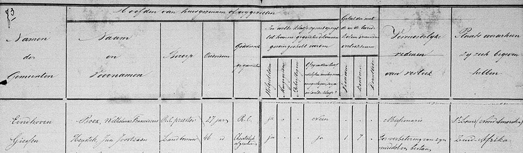 Voorafgaande aan het vertrek wordt de emigratie geheel zoals het hoort bij de Burgerlijke Stand gemeld. In het Landverhuizersregister staat vermeld: Heijstek, Jan Joostzoon, beroep landbouwer, oud 46 jaar, religie Christelijk afgescheiden, welgesteld, vertrekt naar Zuid Afrika. Als motief is genoteerd: “ter verbetering van middelen bestaan”.