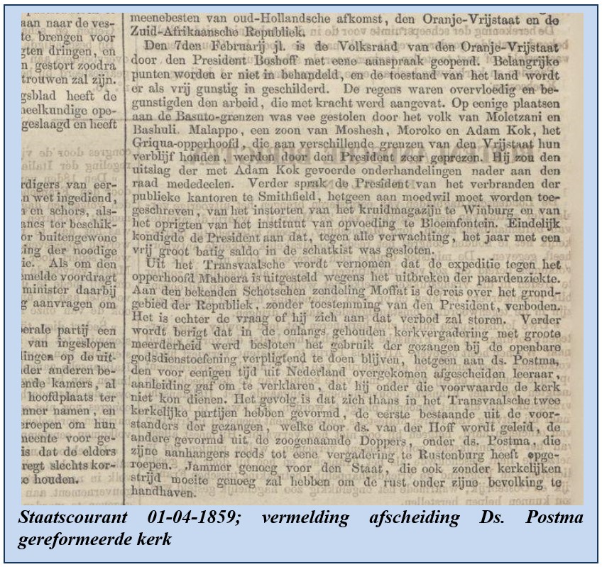 Jan Heijstek volgt de ontwikkelingen in Zuidelijk Afrika zo goed als het mogelijk is. Hij neemt er kennis van dat daar een discussie op gang is gekomen waardoor werd bepaald dat het gebruik van gezangen tijdens godsdienstoefeningen verplicht gesteld zou worden. Ds.Postma kon zicht daar niet in vinden en vond dat hij onder die voorwaarden de kerk niet kon dienen. Hij koos een eigen richting waardoor er twee kerken ontstonden. Een onder leiding van ds. Van der Hoff, met de voorstanders der gezangen en een onder leiding van ds.Postma. Het lijkt daar net Nederland dacht Jan Heijstek die voorstander is van vrijheid van godsdienst.