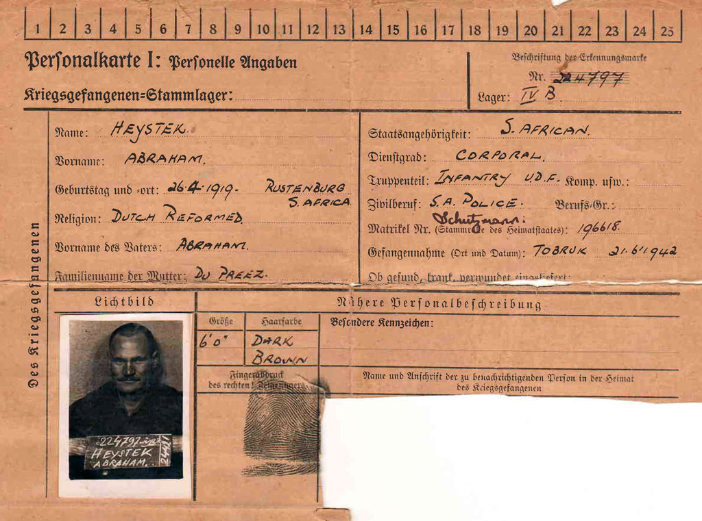 Op de foto van zijn “Personalkarte” zien we een gezonde en besnorde Heystek met een stevig gewicht. De kaart vermeld dat hij Kriegsgefangen was in het Stammlager IV B was. Het grote concentratiekamp bevond zich in Mühlberge aan de Elbe. Het kamp was het grootste van zijn soort in Duitsland met onoverkomelijke capaciteitsproblemen. Krijgsgevangenen hadden te lijden van de overbevolking. Zoals het ontbreken van stapelbedden, beddengoed, kleding en bovenal voedsel.