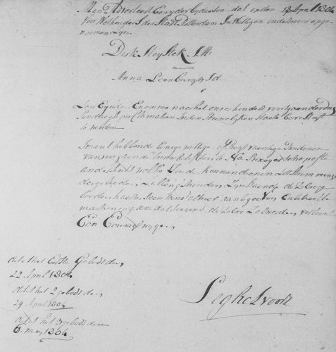 Voor een huwelijk hadden zij onder meer toestemming nodig van wederzijdse ouders. Drie van hun waren overleden wat blijkt uit overlegde aktes van overlijden. De vader van de bruid was nog wel in leven. De gezondheid van deze man hield helaas niet over. Als zieke gelegen in het Gasthuis aan de Hoogstraat in Rotterdam werd hij bezocht door notaris Cornelis Hendricus van der Looij. Na van de vader gehoord te hebben dat hij “volkomen genoegen te nemen van het voorgenomen huwelijk zijne dochter”, stelde de notaris een document op waarmee de huwelijkstoestemming werd vastgelegd. Het officiële stuk werd door de vader ondertekend. Uit dit document blijkt ook dat Dirk Heijstek in die tijd niet meer als schippersknecht werkzaam was, maar een inkomen verdiende als koekkramer. Nakomelingen van hem zouden later in Rotterdam en omstreken bekend worden als poffertjesbakker.