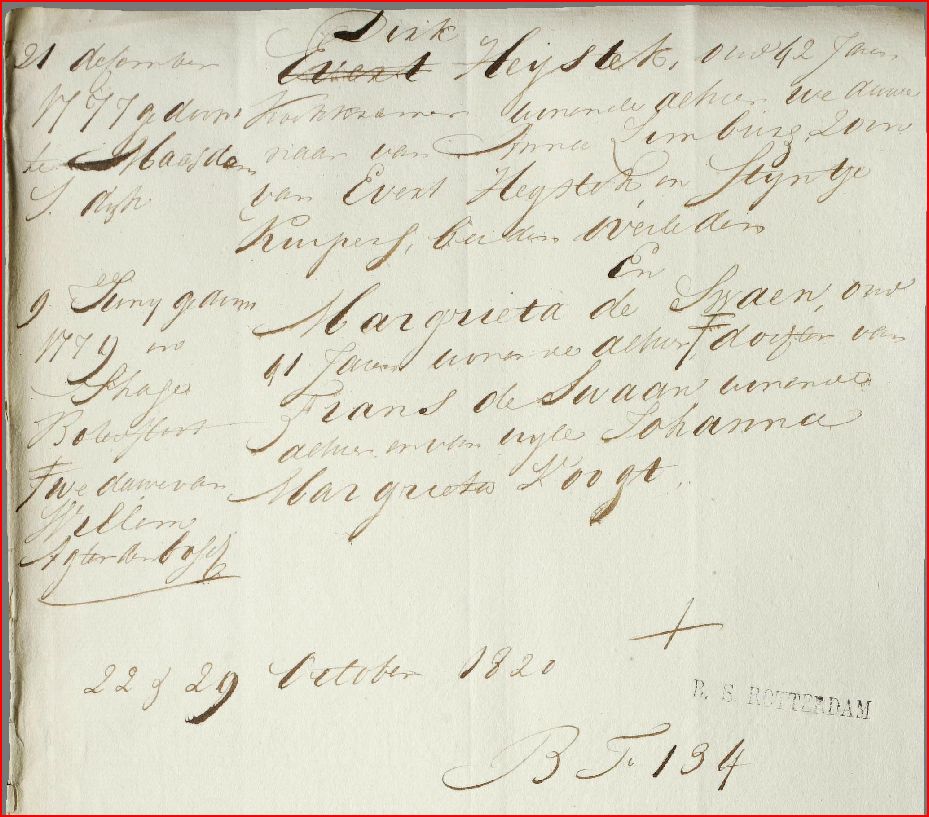 Weduwnaar Dirk, die in Rotterdam aan de Schiedamsche Dijk woonde, kreeg een relatie met de in Den Haag geboren en daar in de Grote Kerk gedoopte weduwe Margrieta de Swaen. Haar doopdatum is 9 juni 1779. Zij is een dochter van Frans de Swaen en Johanna Margrieta de Voogt. Hoewel geboren in Den Haag, woonde zij nu aan de Botersloot in Rotterdam
