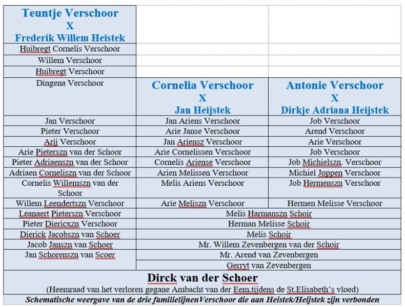 Deze Melis Harmenszn. is niet alleen een voorvader van Antonie Verschoor, maar ook van Cornelia Verschoor die getrouwd was met Jan Heijstek. Ook volgt hieruit dat beiden voorouders delen met Teuntje Verschoor die in Rotterdam in 1941 Frederik Willem Heistek huwde. Zoals in de publicatie “Is Verschoor familie van Verschoor” is beschreven moeten we dan wel vier extra generaties terug in de tijd om dan aan te komen bij Dirck van der Schoer die rond 1350 in Eemkerk werd geboren.