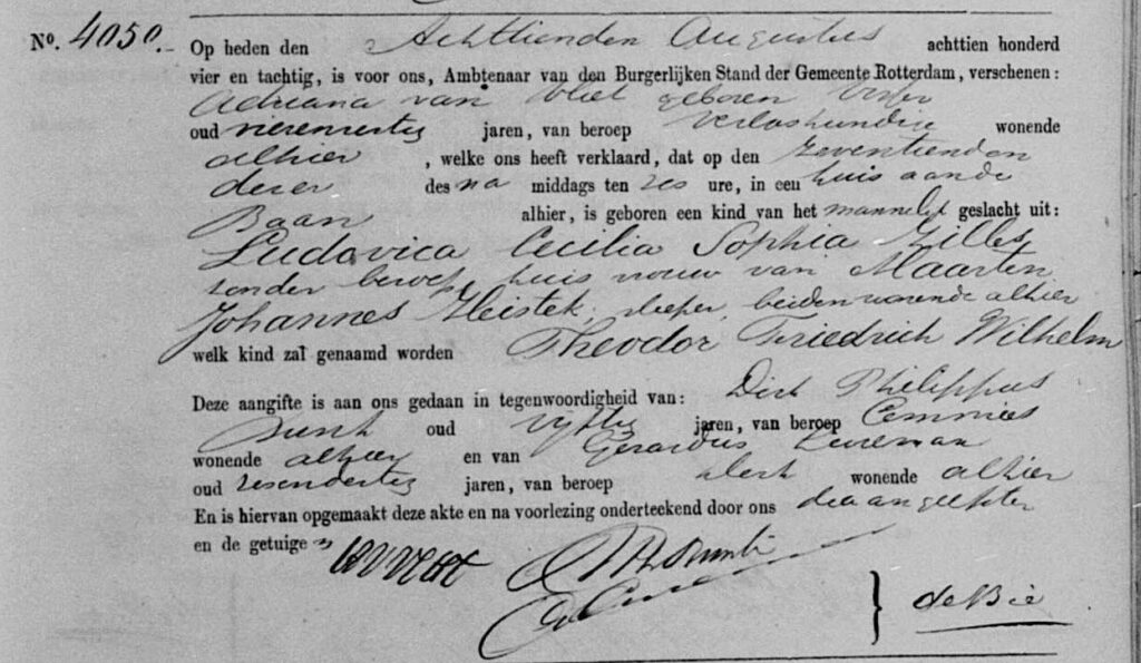 - Frederik Willem. Freek werd geboren op 19 november 1914, zijn beroep was timmerman. Hij is de laatste van het gezin dat nog in leven is en woont thans, 99 jaar oud, in een verzorgingshuis in Schiedam. Frederik Willem huwde op 6 maart 1941 Teuntje Verschoor. In hun huwelijk werden twee zoons geboren. Theodoor Frederik Willem, hij huwde in Schiedam met Huberdina Adriana Bierhoff en kreeg twee dochters, Jolanda en Carla. De jongste zoon Frederik Willem trouwde in Delft met Sylvia Theodora van Vliet, zij kregen een zoon Ronald en een dochter Astrid.