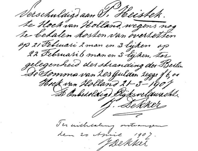 Het jaar 1907 nauwelijks twee maanden oud, bracht opeens extra verdiensten voor het gezin met zich mee. Op 21 februari 1907 smeet een grondzee het binnenkomende S.S. Berlin, een Harwichboot, op het Noorderhoofd van Hoek van Holland. Het afbrekende voorschip sleurde de daarop samengestroomde passagiers de diepte in. Honderdnegenentwintig passagiers kwamen bij deze ramp om het leven. De slachtoffers spoelden op het strand aan, of lagen tussen de stenen van de pieren. Mijn grootvader zocht met anderen naar aangespoelde lichamen en bracht ze daarna in een vlet of roeiboot naar de Berghaven. Andere gezinsleden waren behulpzaam in het mortuarium, ondergebracht in de Fruitloods van Hudig en Pieters. Voor de zwakke gezondheid van opa betekende dit gezwoeg in weer en wind de doodsteek. Na een langdurig ziekbed overleed hij op 4 december 1907. Hij was toen 36 jaar oud.