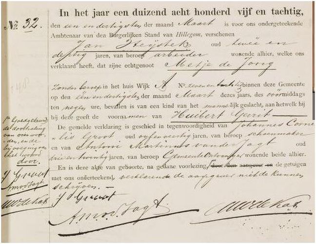 De eerder genoemde Metje de Jong beviel in 1883 van een zoon die zij de naam Huibert hadden gegeven. Dit kind zou slechts elf maanden oud worden. Na een tweede zwangerschap kwam op 31 maart 1885 Huibert Gerrit op onze wereld.