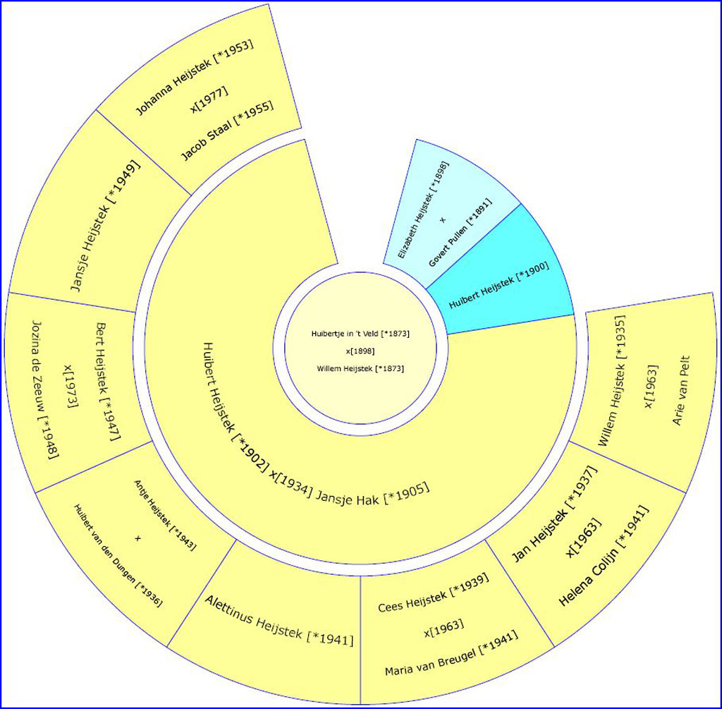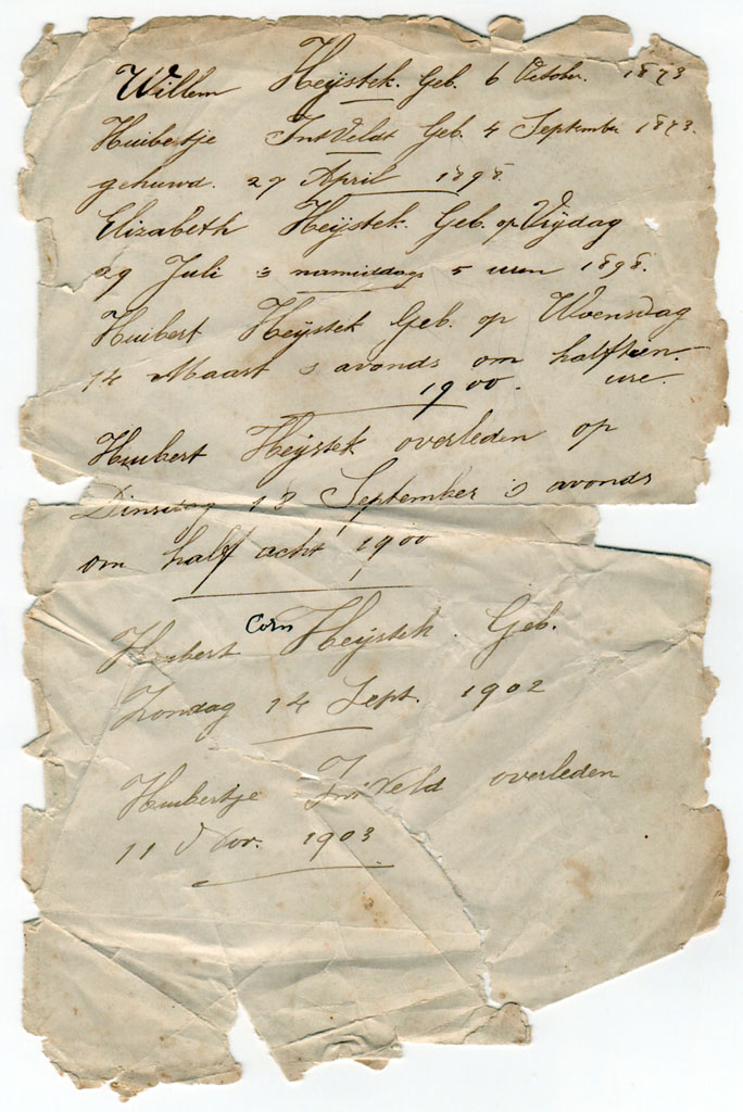 Is genealogie van alle tijden? Zeker is dat vele door generaties terug onderzoek werd gedaan naar voorouders. Zo trof Bert Heijstek eens in een statenbijbel een door zijn grootvader Willem Heijstek handgeschreven document aan. Die had een begin gemaakt van een Heijstek-stamboom. Namen met geboortedata en de geboortetijd heeft hij nauwkeurig vastgelegd. Als laatste noteerde Willem het overlijden van zijn echtgenote Huibertje in ’t Veld op 11 november 1903. Over deze vrouw zijn we meer te weten gekomen.