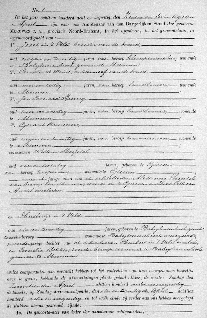 Op enig moment hebben Willem en Huibertje elkaar ontmoet en aardig gevonden, wat resulteerde in een zwangerschap en een daaropvolgend huwelijk dat op 27 april 1898 in Meeuwen werd gesloten. Op de heugelijke huwelijksdag werd het bruidspaar vergezeld door de getuigen Joost in ’t Veld (broer van de bruid) een 29-jarige klompenmaker; Cornelis de Wind (achterneef van de bruid) een 64-jarige landbouwer, Jan Leonard Sprang, een 42 jarige landbouwer en door Gerard Remmers een timmerman van 29 jaar. Volgens de huwelijksakte was Willem in die tijd een koopman, later zou hij net als zijn vader en schoonvader landbouwer worden. Huibertje die voor hun eerste kind moest gaan zorgen had geen beroep. Het jonge paar vestigde zich in de gemeente Almkerk-Uitwijk.