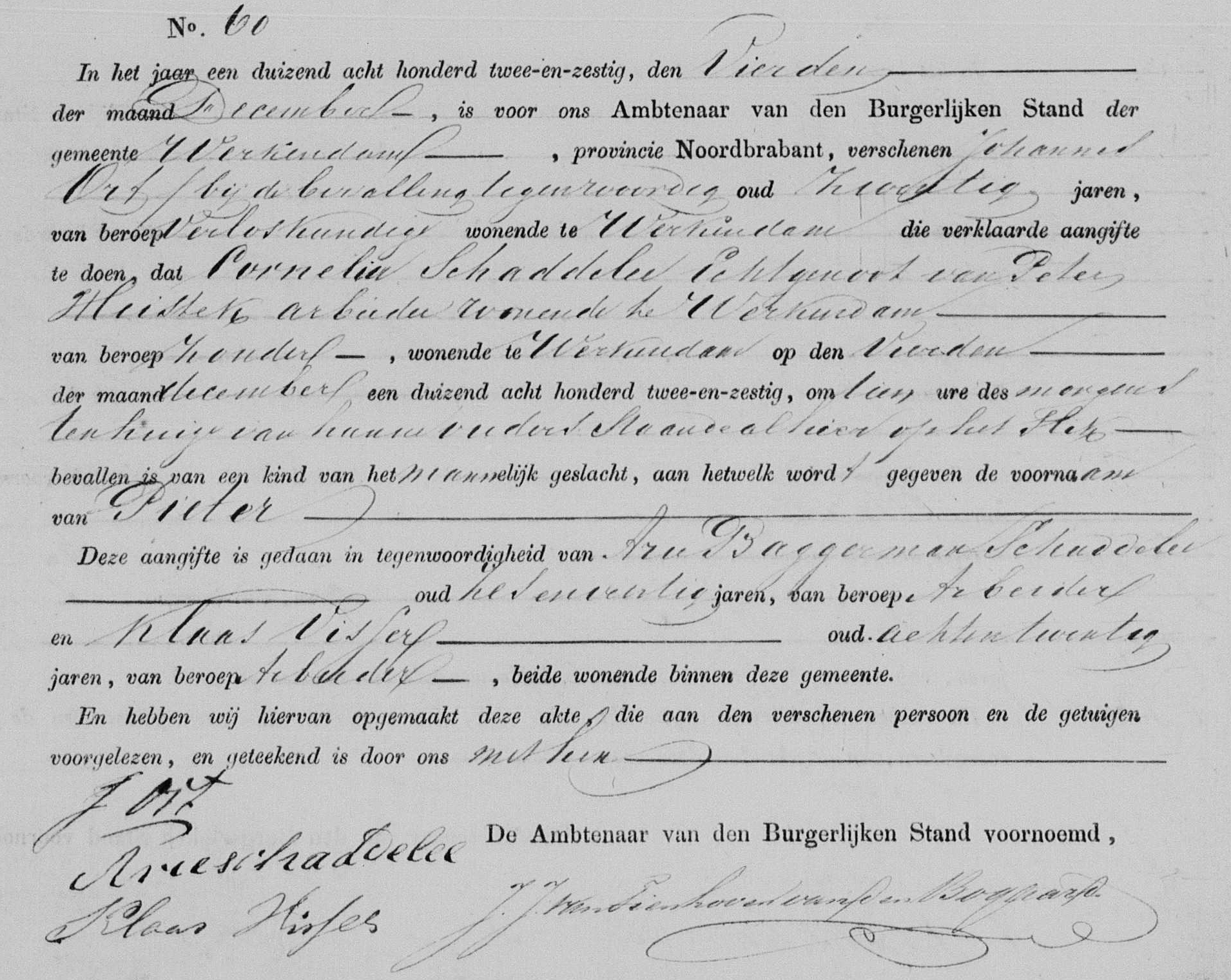 Het is dinsdag 4 december in het jaar 1862 als Johannes Ort bij de Burgerlijke Stand van de gemeente Werkendam aangifte gaat doen van de geboorte van Pieter Heistek. Hij kan dat omdat hij ’s morgens om tien uur die dag als verloskundige bij de geboorte aanwezig is geweest. Vandaar dat hij zonder enige terughoudendheid de geboorteakte mede ondertekend zodat Peter net als zijn vader als een Heistek is het doopboek is terecht gekomen.