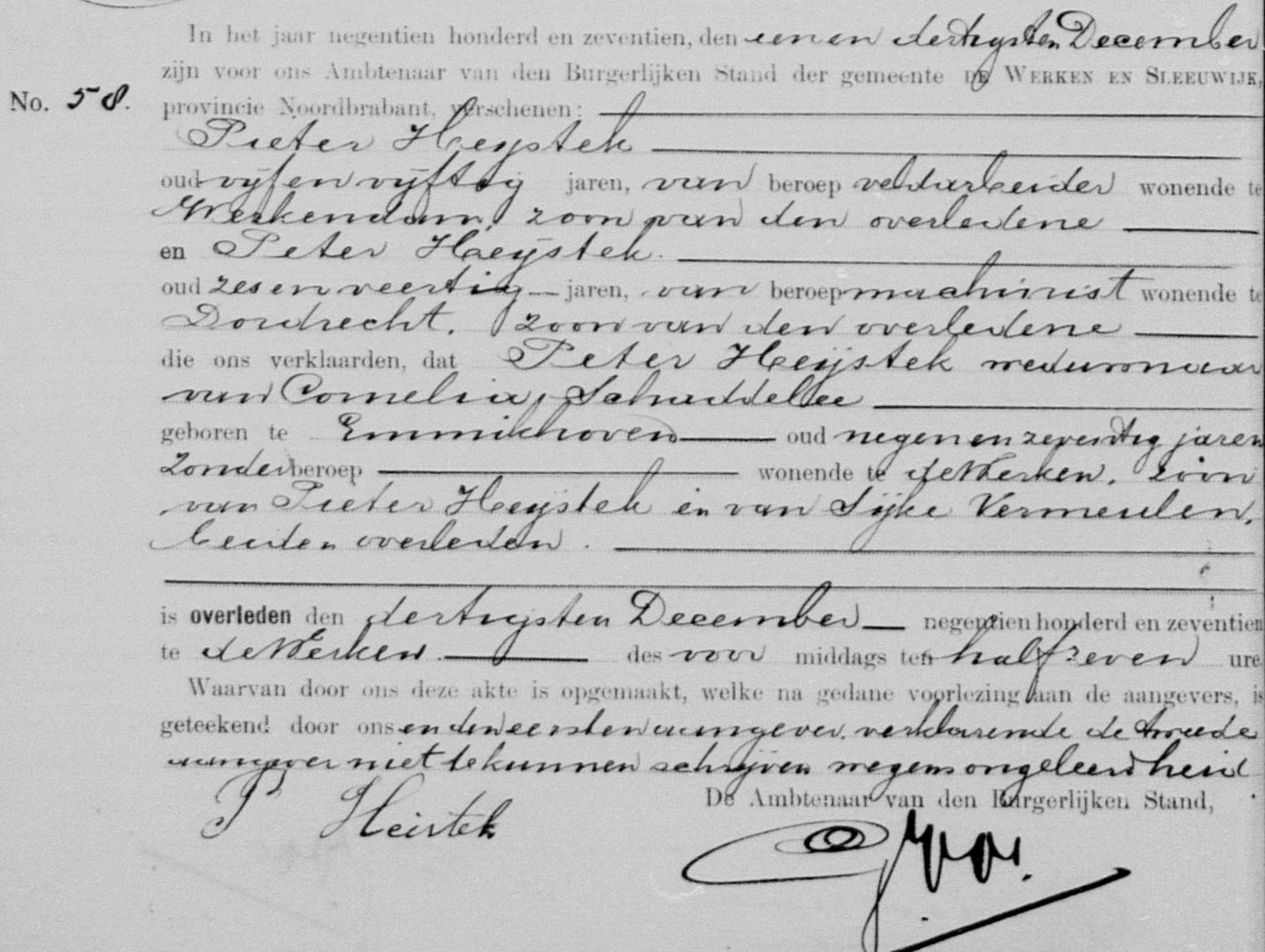 Peter zal de vergissing ontgaan zijn. Verwijzend naar hem noteerde de ambtenaar over hem: “niet te kunnen schrijven wegens ongeleerdheid”. Pieter tekent de akte goed leesbaar met P. Heistek. Moeder Cornelia Schaddelee was al vijf jaar eerder overleden.