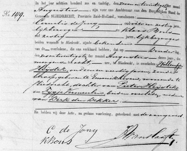 Op de vrijdag 27e augustus 1886 verschijnen Cornelis de Jong en Klaas Bons voor de ambtenaar van de Burgerlijke Stand in Sliedrecht om daar als lijkbezorgers aangifte te doen van het overlijden van “Willempje Heijstek”. Geheel volgens zijn taak vult de BS-ambtenaar de nodige papieren in en tekent daarbij op dat de overledene weduwe is van Dirk den Dekker en dochter van Pieter Heijstek en Sijgje Vermeulen. Als leeftijd wordt 41 jaar ingevuld, waaruit blijkt dat een rekenfoutje zo is gemaakt. Beide Willemkes waarover het hier gaat zijn voor de 27e augustus 1844 geboren en zouden nu dus 42 jaar zijn geweest. Desondanks zijn het genoeg aanwijzingen om zeker te stellen dat we hier te maken hebben met onze “Willemke II”.