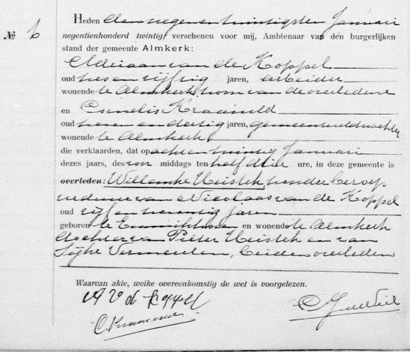 We maken een stap in de tijd. Het is dan de donderdag de 29e januari 1920 als Adriaan van der Koppel de zware taak heeft om bij de plaatselijke Burgerlijke Stand het overlijden van zijn moeder Willemke aan te geven. Zij overleed een dag eerder. In de Akte van Overlijden schreef de ambtenaar dat Willemke Heistek vijfenzeventig jaar oud was, weduwe van Nicolaas van der Koppel en dochter van Pieter Heistek en Sijke Vermeulen. Als dit laatste waar zou zijn, dan is Willemke II voor de tweede keer overleden. Echter, hier is sprake van een ambtelijke verschrijving. De dienstdoende ambtenaar heeft in het gemeentearchief gezocht naar de geboortegegevens van een Willemke Heistek. Toen hij een Willemke uit 1844 had gevonden, meende hij de juiste kaart in zijn handen te hebben. Hij stelde de Akte van Overlijden op en vulde daarbij zo onbewust onjuiste namen in van de door hem vermeende ouders. Volgens geldende voorschriften moet de dienstdoende ambtenaar de akte hardop hebben voorgelezen. In dit geval is dat gebeurd in aanwezigheid van de plaatselijke veldwachter. Daarbij zal het zoon Adriaan zijn ontgaan dat foutieve namen van zijn grootouders op het formulier zijn ingevuld. Helemaal vreemd hoeft dat ook niet te zijn. Grootvader Jan was al voor de geboorte van Adriaan overleden en zijn grootmoeder kende hij mogelijk alleen onder de naam “opoe”. Hoe moest hij dan verstaan dat er onjuiste namen in de overlijdensakte zijn gekomen?
