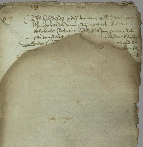 Nog net konden we lezen: Op huijden den 17e januarij van het jaar 16 tweeënveertig compareerde voor mij Govert Rota, openbaar notaris bij den hoven van Hollandt geadmitteert …. binnen de stad Delft, en toen hield het vanwege geleden waterschade op. Was het een Heijstek die voor de notaris was verschenen? We zullen het nooit weten.