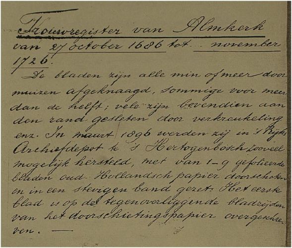 Een ander voorbeeld. We kregen een document ter inzage zijnde het trouwboek uit Almkerk 1686-1726. In die omgeving woonden veel Heijstekken. Vandaar dat deze boeken het verdienen om zorgvuldig te worden gelezen. Het heeft ons al veel bruikbare informatie over de familie opgeleverd. Het boek zag er gerestaureerd uit, en dat was het ook. Op de tweede folio was de volgende tekst te lezen. Zie de tekst van de afbeelding.