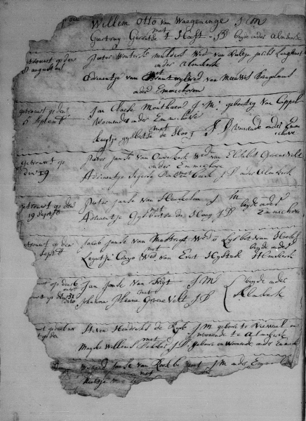 Het deed ‘t ergste vrezen. Maar soms zit het mee. Een voor ons interessante bladzijde was ook door muizen aangevreten, maar gelukkig was nog steeds te lezen dat Leijntje Gerits Craijo de weduwe van Evert Heijstek opnieuw was getrouwd. Deze keer met weduwnaar Jacob Janse van Mastrigt. We kunnen nog lezen dat het huwelijk in september 1723 werd gesloten. Het stukje papier met de juiste datum is in de keel van een muis verdwenen. Het huwelijk kan zijn afgesloten op de 19e of later in september van dat jaar.