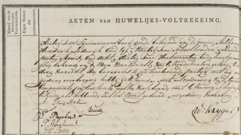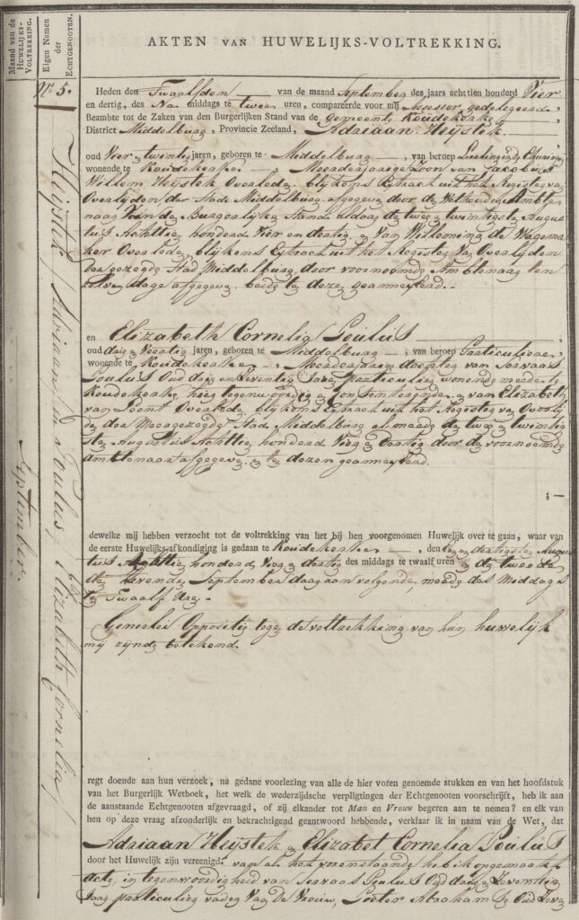 De behandeling in het Gasthuis zal hem goed hebben gedaan. Adriaan herstelde snel en werd in 1834 als schutter opgenomen in de Zeeuwse Mobiele Schutterij. In dit zelfde jaar gaf hij ook zijn jawoord aan z’n geliefde de dan 43-jarige Elizabeth Cornelia Poulus. Zij is een dochter van Servaas Poulus en Elizabeth van Loent. Op 12 september 1834 traden zij in Koudekerke in het huwelijk. Op de uitgeschreven huwelijksakte is te lezen dat Elizabeth van beroep “particulier” is (dus zonder beroep) en dat Adriaan toen leerling in de Chirurgie was. Hij was in opleiding om Heel- en Vroedmeester te worden. Een mooie titel voor een mannelijk geneeskundige die zich na zijn algemene medische vorming toelegt op verloskunde.