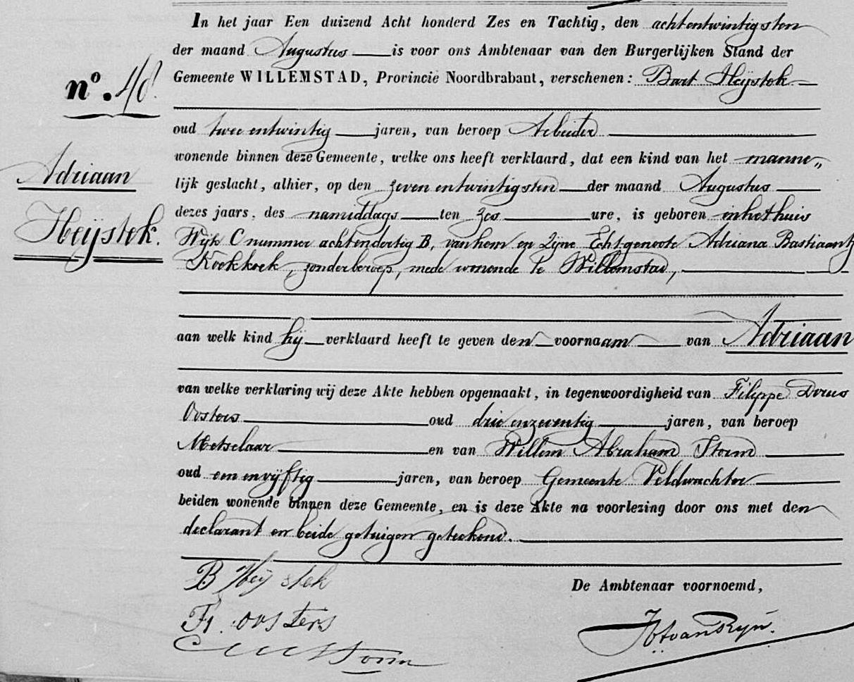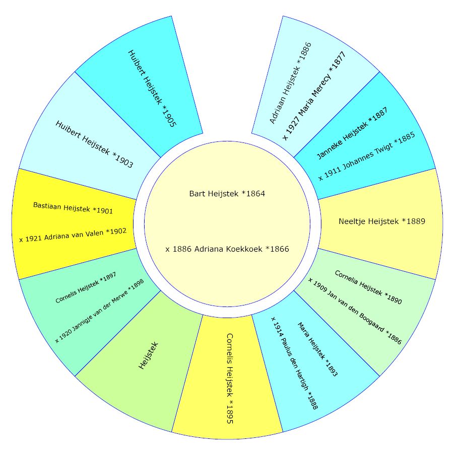 Mijn grootvader Bart Heijstek was één van de twaalf kinderen van Adrianis. Opa Bart werd in Willemstad geboren op 31 mei 1864 en overleed in Dordrecht op 9 mei 1934. Hij trouwde in Willemstad op 21 augustus 1886 met de eveneens uit Willemstad afkomstige Adriaantje Bastiaantje Koekkoek. Hoewel hij zonder enige twijfel zelf nooit heeft gevoetbald, heeft hij toch een elftal kinderen op de wereld gezet.