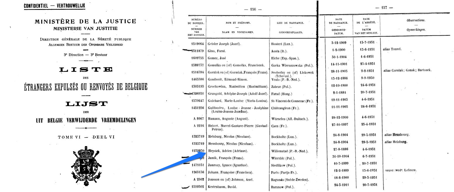 Veel weet ik niet van Adriaan. Wel is bekend geworden dat de Centrale Inlichtingendienst van het Belgische ministerie van Justitie hem op een geheime lijst plaatste met uit te zetten vreemdelingen. Waarom is een raadsel voor mij. Gevolg van deze maatregel is dat de Belgische overheid bij Koninklijk Besluit op 4 juni 1931 beslist heeft Adriaan het land uit te zetten en dat zij dat op 22 oktober van dat jaar tot uitvoering hebben gebracht.
