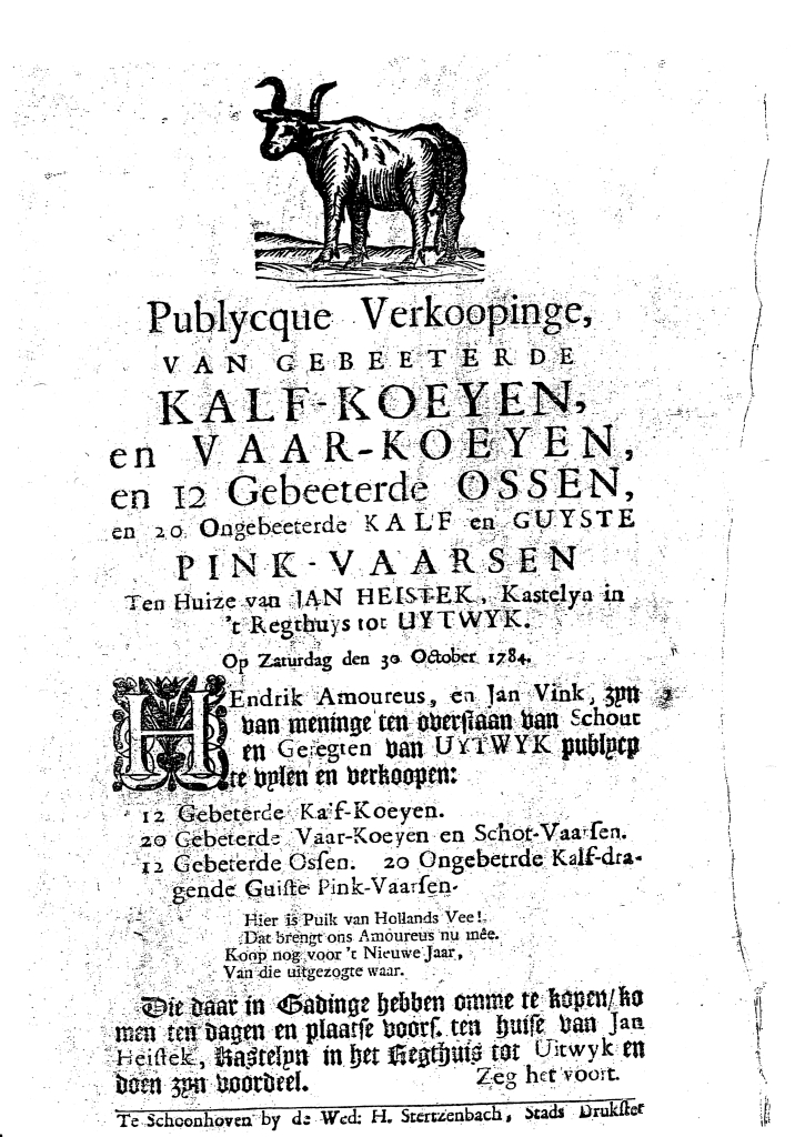 Op het afgebeelde affiche ziet U dat er op 30 oktober 1784 een publieke verkoop was ten huize van Jan Heistek, kastelein in ‘t Regthuys te Uitwijk. Wel weten we dat het pand in de negentiende eeuw als boerderij in bezit was van Allettinus Heijstek.