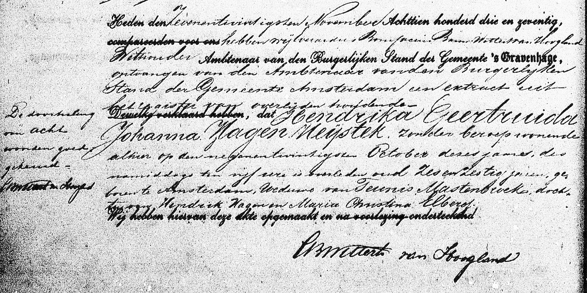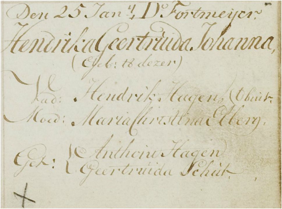 Uit zijn eerste huwelijk had de notaris reeds een zoon, de zevenjarige Antonius Marius Heijstek, en werd nu stiefvader van drie kleine kinderen waaronder de baby die op 18 januari 1807 was geboren en die met de namen Hendrika Geertruida Johanna in de gemeente Amsterdam werd ingeschreven. Het droeg de familienaam Hagen, gelijk aan die van haar biologische verwekker.