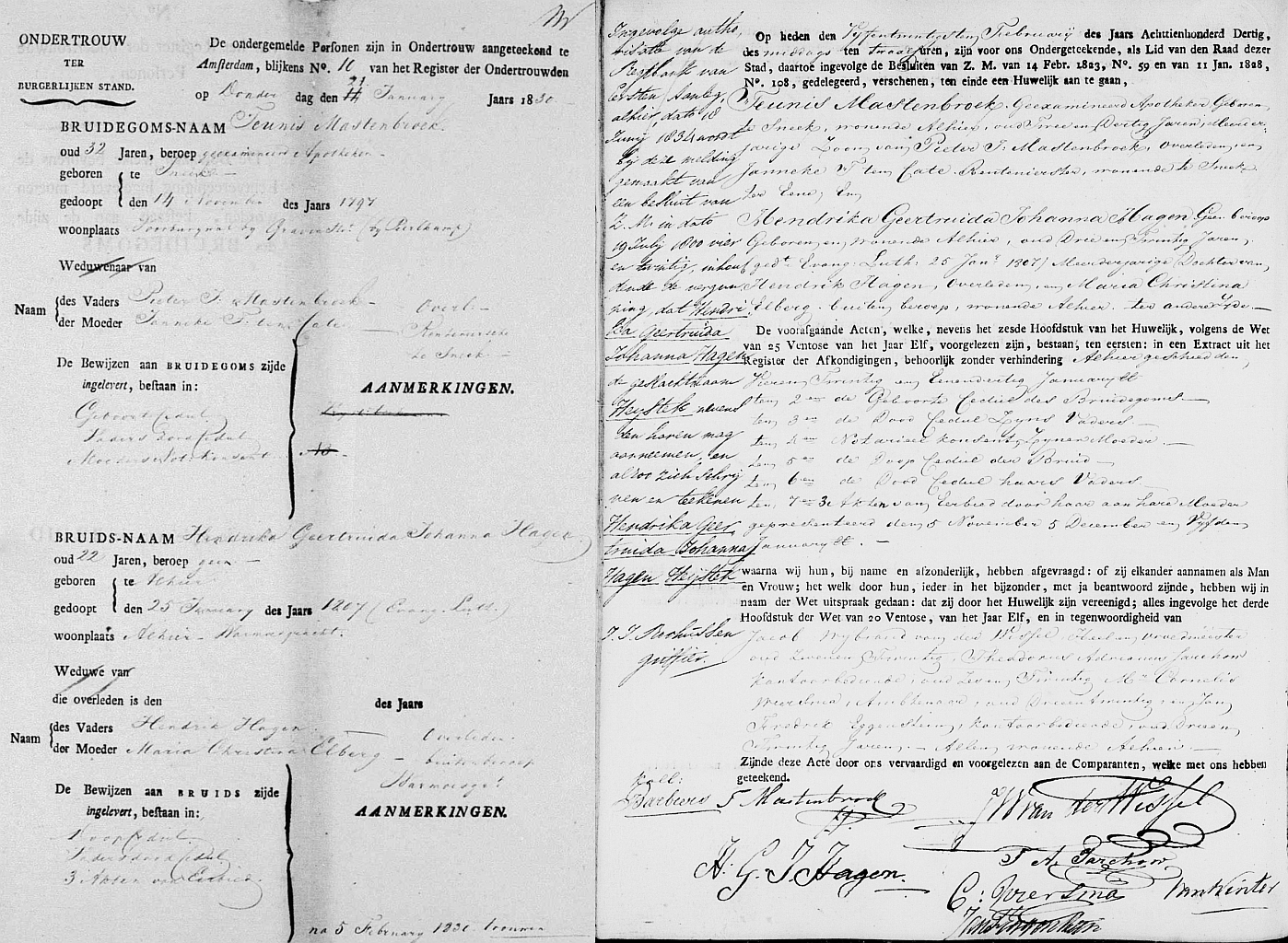 Op 21 januari 1930 gaan de jonge lieden in ondertrouw. Dat deze akte niet door de moeder van Hendrika Geertruida Johannais ondertekend ligt voor de hand. Het huwelijk wordt op 25 februari 1830 voltrokken. Op de huwelijksakte wordt ondermeer melding gemaakt dat in het dossier zijn opgenomen “drie Akten van Eerbied aan haar moeder gepresenteerd”.