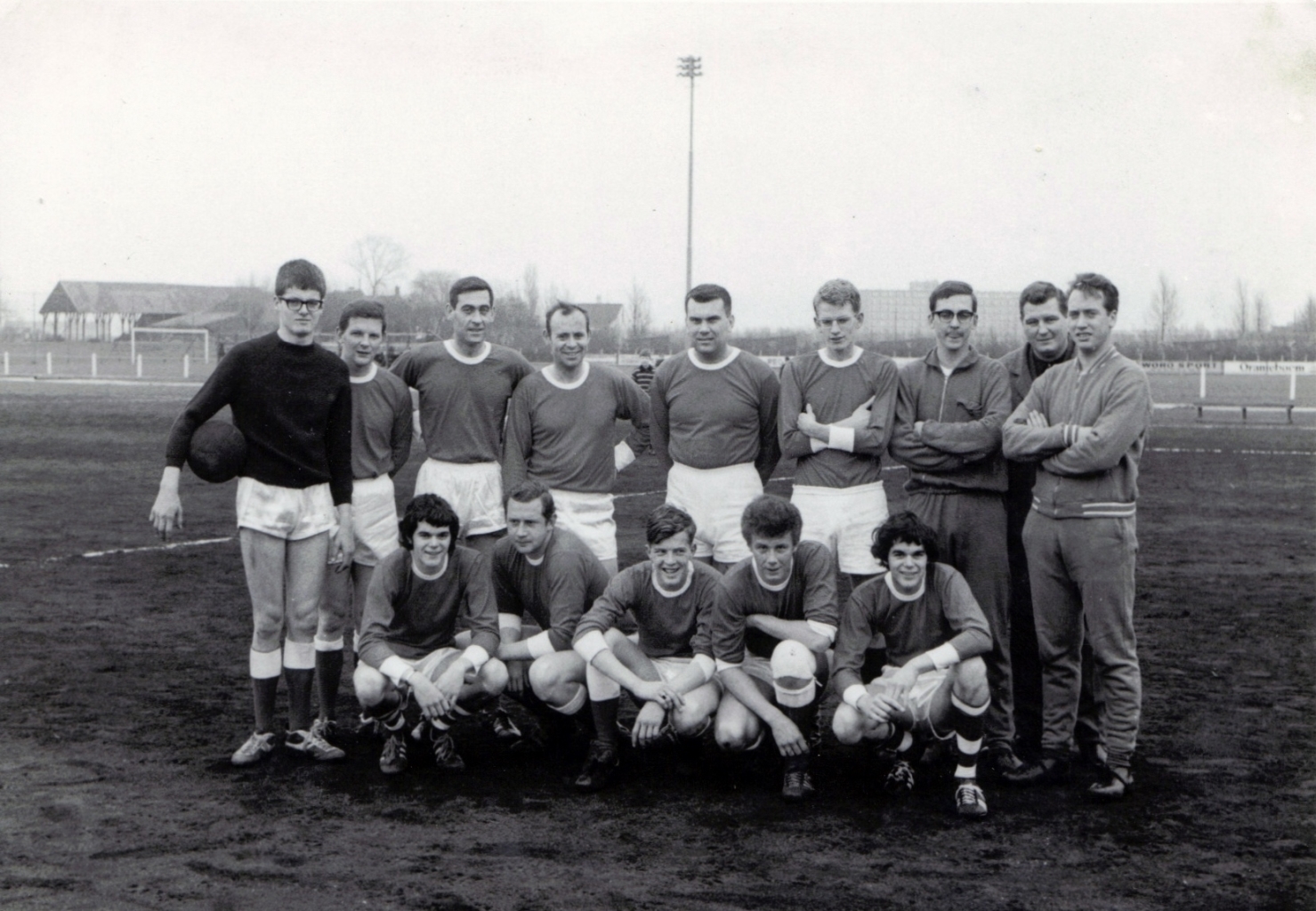 Het bovenstaande speelde zich af in de jaren vijftig en eerste helft van de jaren zestig. In 1966, inmiddels getrouwd en wonend in een van die Rotterdamse, na de oorlog gebouwde nieuwbouwwijken ging ik een nieuw avontuur aan. In de nieuwe wijk richtte men een nieuwe vereniging op [Alexandria ‘66]. Ik werd lid met de gedachte nu wel dicht bij huis te kunnen spelen en trainen. Trainen ging nog wel op die eindeloze zandvlaktes van de nieuwbouw, maar ook deze vereniging moest de eerste twee jaar zijn thuiswedstrijden spelen in die zelfde vergaarbak van tientallen velden, Laag Zestienhoven aan de andere kant van de stad. Soms mochten we gebruik maken van een veld van een bevriende vereniging. Hoe zo’n veld eruit zag? Zie bijgaande zwart-wit foto en de ondergrond was inderdaad zwart, ook wel koolas of sintels genoemd.