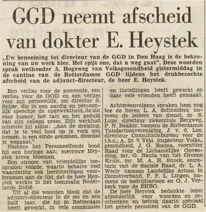 Dat hij beschikt over een zuiver en mild oordeel alsmede over een diep gevoel voor humor samen met een grote werkkracht en een gedegen vakkennis waardoor hij aan hem voorgelegde grote problemen kan oplossen, is de GGD in Rotterdam niet ontgaan. Op de eerste januari 1949 treed Heystek daar als adjunct-directeur in dienst en gaat hij een bijdrage leveren aan de wederopbouw van Nederland en aan alles wat daar bij komt kijken.