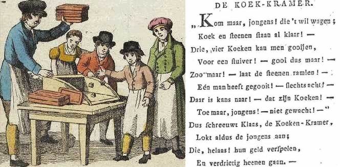 Oorspronkelijk was een kramer iemand die allerlei waren in het klein verkocht of zoals in het Handvest van Amsterdam nauwkeuriger stond aangegeven: “Te doen ofte hanteren eenige van de neringen, hier na verklaart ende gespecificeert, te weten, Kramerije, Vettewarije, Laken-verkoopen, enz.” Er waren kramers die met een soort draagmand op hun rug (een mars genoemd) bij potentiële klanten langs gingen, zo iemand heette dus een marskramer. Het is zeer wel mogelijk dat er al eerder kramers waren onder onze naamgenoten, de eerste zwart op wit vermelding komt op naam van Dirk Heijstek (Maasdam 1777 – Rotterdam 1839). Vanuit zijn geboorteplaats Maasdam trok hij over de toen nog Zuid-Hollandse eilanden, verbleef enige tijd in Den Bommel en Ooltgensplaat alvorens in 1807 naar Rotterdam te trekken. Hij was kramer in galanterieën, later koekkramer en er is een vermelding gevonden dat hij in 1834 op de beestenmarkt in Oud-Beyerland stond. Nu dacht ik dat de koekkramer wel koeken te koop zou aanbieden, maar dat is niet altijd het geval. Ik vond een afbeelding met tekst en daaruit bleek dat hij wellicht heel wat anders deed. Oordeelt U zelf: