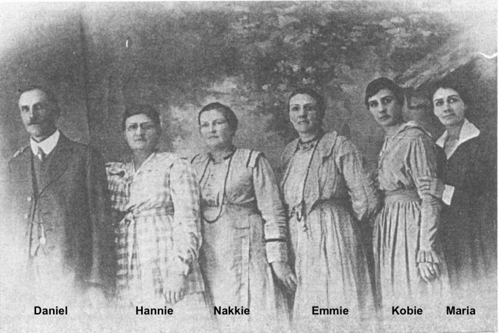 Ouma Hannie and some of her Heystek siblings, ~1919. Nakkie and her family found themselves under attack at Derderpoort in 1899. Fiesty Emmie wrote at length about the Heysteks’ experiences during the Second Boer War. Ousus is not in this photo. (Ouboet Daniel’s twin brother had died at birth, young Abraham died before the war at 17 years old. Middle brother Jan died during the war. Kobie’s twin sister Josina died in 1903 during childbirth.)