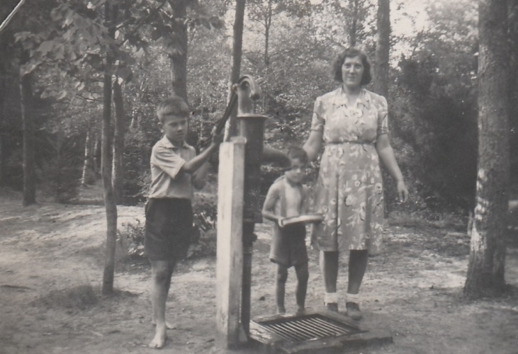 Maar dan 1947, het gezin van Maarten en Belie en hun twee kinderen gaat voor het eerst van hun leven met z’n vieren op een heuse vakantie. De Bijenkorf had voor zijn personeel een aantal vakantiehuisjes in Epe en daarvan mocht ook het personeel gebruik maken. Het zou een hele reis worden, per tram van huis naar station Rotterdam-Maas, de trein naar Utrecht, overstappen op de trein naar Apeldoorn en dan de bus naar Epe. Reistijd enige uren. En als we nu naar de bagage kijken zou men denken dat het een vakantie van een paar weken zou worden. Bent U nieuwsgierig wat in het pakpapier was gewikkeld? Eén ervan was een pan met vlees en jus, dat koop je niet in Epe, dat neem je van huis mee. Dat alles was het meer dan waard: een hele week in een houten huisje met terras in een park met zwembad, wat een enorme luxe voor die tijd. De huisjes hadden geen toiletten, dus daarvoor naar een bijgebouwtje. Evenmin was er water, maar de pomp was vlakbij en wat was nu mooier voor een stadsgezin als “emmertje water halen”.