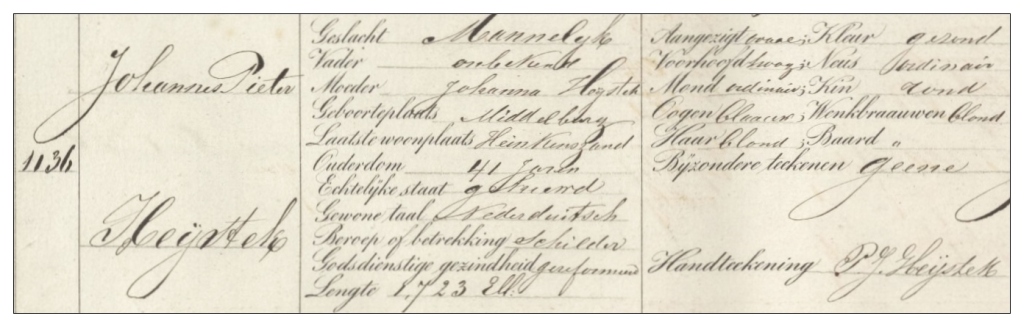 Ja, er was orde en tucht in de negentiende eeuw. Hoe dat nu is, daar heeft ieder wel een mening over. Een volgend voorbeeld is Pieter Johannes Heijstek, geboren in Middelburg op 15 mei 1825. In de processen-verbaal werden zijn voornamen omgedraaid, daarin werd hij aangeduid als Johannes Pieter. Maar zie zijn handtekening: hij tekent met P.J. Hij was een zoon van Johanna Heijstek en van een onbekende vader. Hij werd in 1866 veroordeeld voor het “uiten van smaad of scheldwoorden”. In de tegenwoordige tijd zou dat misschien wel mogen, men zegt al heel gauw dat het valt onder de vrijheid van meningsuiting. Johannes moest er vier dagen voor naar het gevang. Vanwege die vier dagen weten we nu, 150 jaar later, alles over hem. Wij beschikken niet over een foto uit die tijd, maar wel over een zeer gedetailleerde beschrijving. Een goede tekenaar zou hem zo kunnen uittekenen.