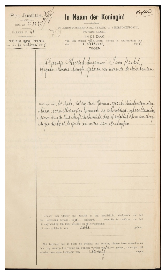 Geertje Heistek, geboren in De Werken op 12 oktober 1864 en in 1893 getrouwd met Pieter van Brakel zou de plaatselijke veldwachter hebben mishandeld of wilde zij hem gewoon nieuwjaar wensen? De aanklacht: dat zij den 1 Januari 1902 te Werkendam den aldaar surveillerenden gemeente en onbezoldigd rijksveldwachter Simon van de Ruit heeft mishandeld door opzettelijk hem een stomp tegen de borst te geven en in den arm te knijpen.” Het kostte Geertje een boete van acht gulden en bij niet-betaling binnen twee maanden twaalf dagen hechtenis.