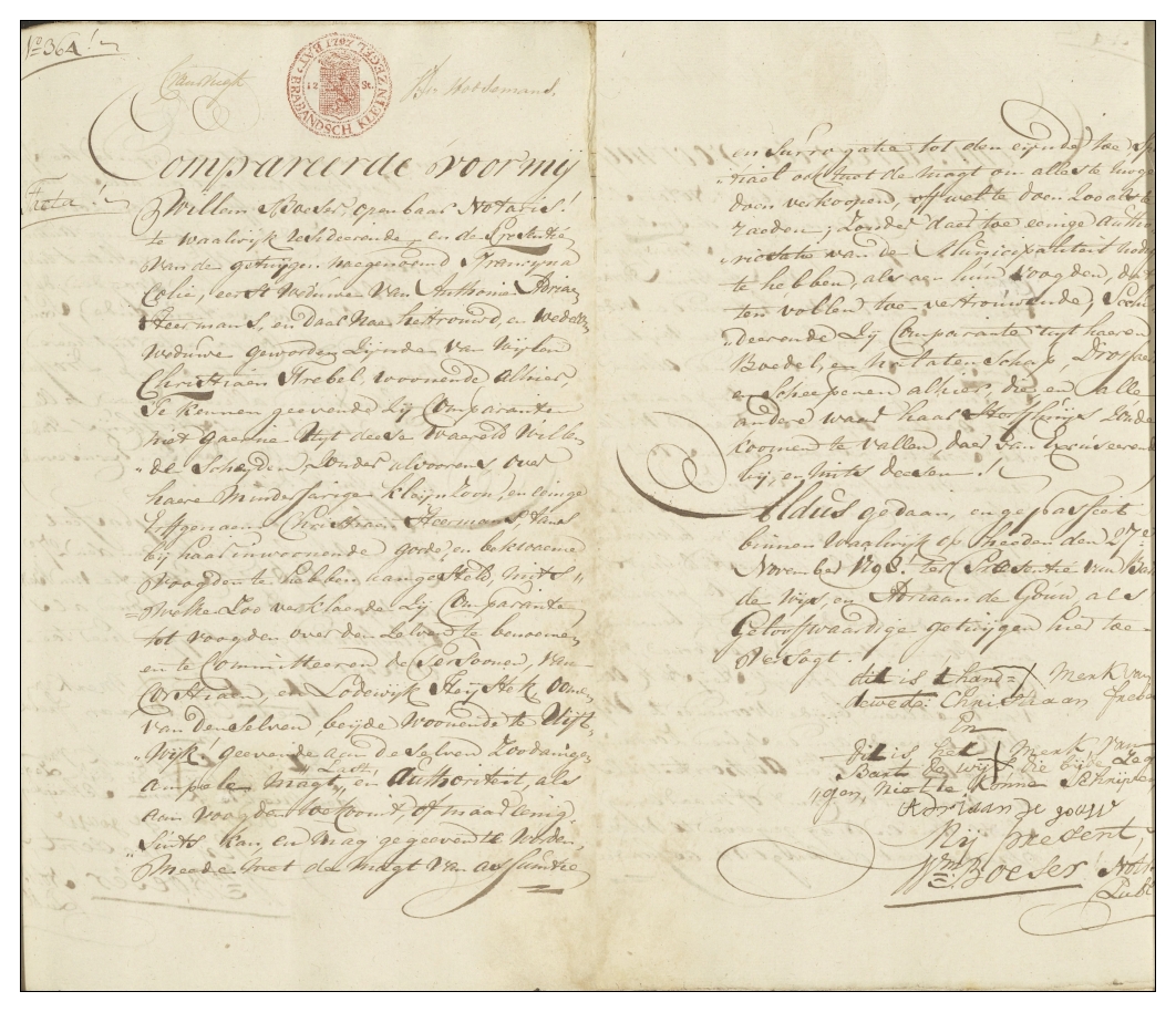 Het kan niet anders dan vastgesteld, dat weduwe Francijna Colie een geregelde cliënt was bij notaris Boese. Op de 27e november 1798 was zij opnieuw op zijn kantoor om daar de voogdij over haar kleinzoon te regelen. In het document is te lezen … dat zij comparante niet gaarne uijt dese weereld willende scheijden zonder alvoorens over haare minderjarige kleijnzoon en enige erfgenaam, Christiaan Heermans, tans bij haar inwoonende goede en bekwaeme voogden te hebben aangesteld ……… Christiaen (= Corstiaen) & Lodewijk Heijstek ooms van Christiaan Heermans uit Uitwijk.