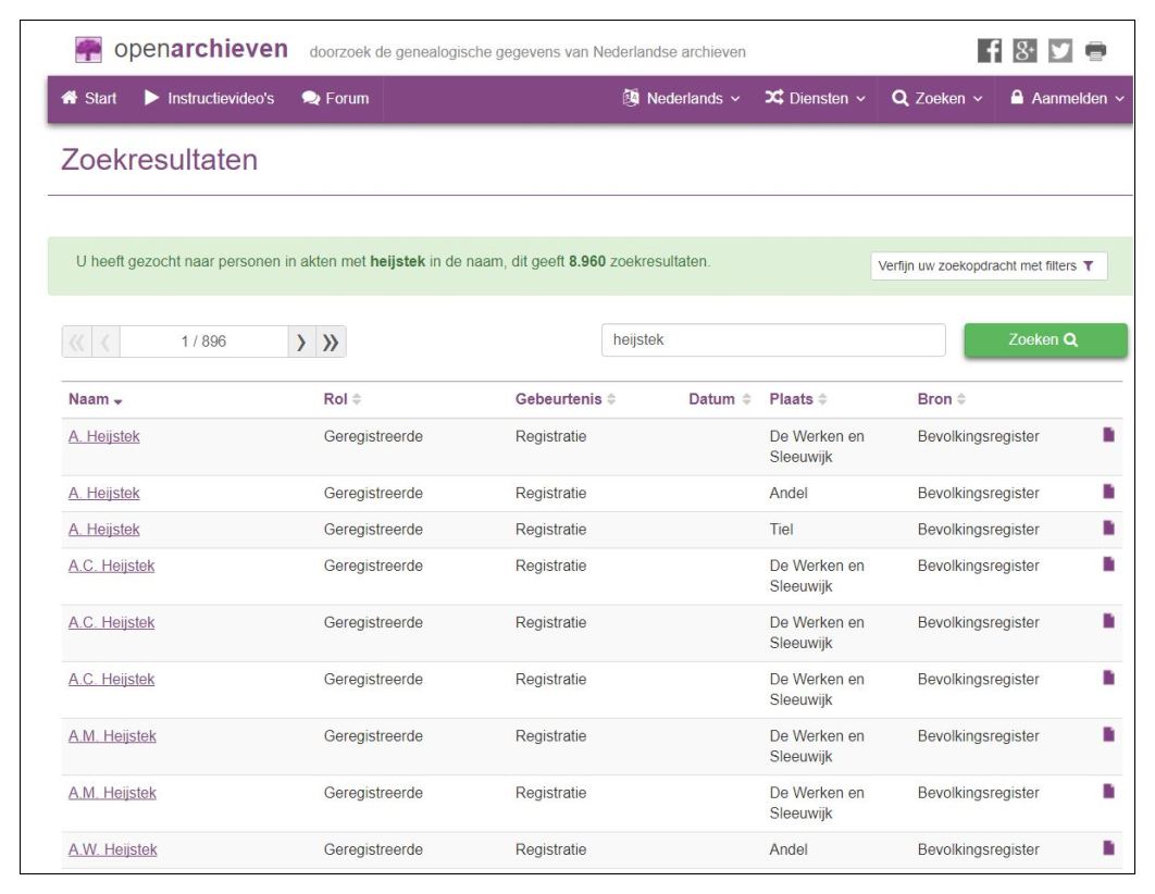 Na het invoeren van de familienaam wordt er gezocht in meer dan 220 miljoen archiefstukken en beschrijvingen. Vervolgens kan er op “genealogie” worden geselecteerd wat het aantal treffers meteen een stuk overzichtelijker maakt. Indien de gezochte persoon is gevonden kan worden doorgeklikt en komt de onderzoeker op bijvoorbeeld een regionaal archief. In veel gevallen kan men daar de gezochte akte downloaden.