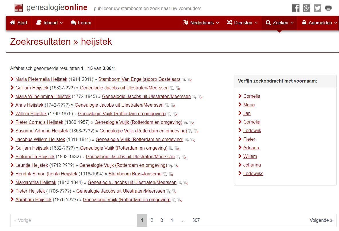 Deze website is van een geheel andere orde en dient ook anders te worden benaderd. Genealogieonline is een platform waarop familieonderzoekers hun stamboom kunnen publiceren. Deze stambomen kunnen interessant zijn om die met de eigen gegevens te vergelijken of om suggesties op te doen in welke richting men kan zoeken voor een voorouder die in de eigen stamreeks ontbreekt. Terughoudendheid ten aanzien van het overnemen van de data uit deze stambomen ligt voor de hand omdat er onjuistheden in kunnen voorkomen. Desalniettemin een zeer interessante bron.