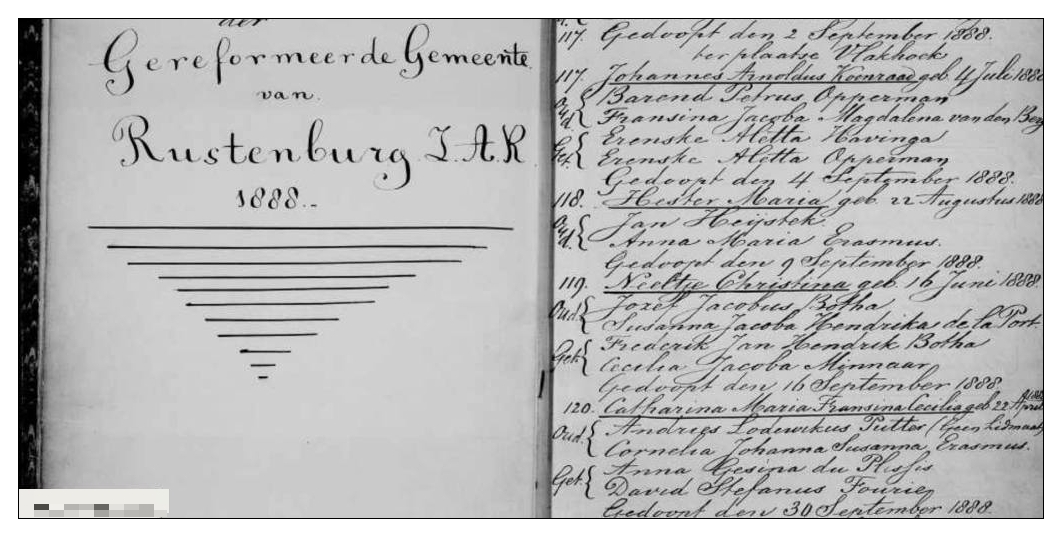 Christening of the youngest daughter, Hester Maria, in 1888 at the Rustenburg Reformed Church. (Middle of the page)
