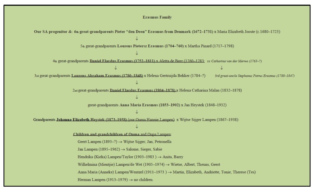 In August of 1836, about six weeks after the van Rensburgs were massacred by Manukosi, more Voortrekker groups who were following Potgieter to the north, crossed the Vaal River and were camping in separate groups. Among them was the Erasmus hunting party (who in reality were scouting for land for their families to settle on.) The hunters were led by Stephanus Petrus Erasmus, brother of Ouma Hannie Heystek-Lampen’s great-grandfather, Lourens Abraham Erasmus. (See family graph). The Erasmuses were suddenly ambushed in a horrific attack by the Matabele. Amidst the carnage, Stephanus and his youngest son managed to escape, but two of his sons were carried off by Matabele-impis, along with his wagons and trek oxen. His two sons were never found again. Stephanus galloped on to warn other groups close by, including the Liebenberg family, who refused to believe him and accused him of trying to get them to turn back across the Vaal River. Stephanus galloped on to warn others. Except for four children hiding under their wagon, and one girl who survived her assegai wounds, the whole Liebenberg family was murdered in the subsequent Matabele attack.