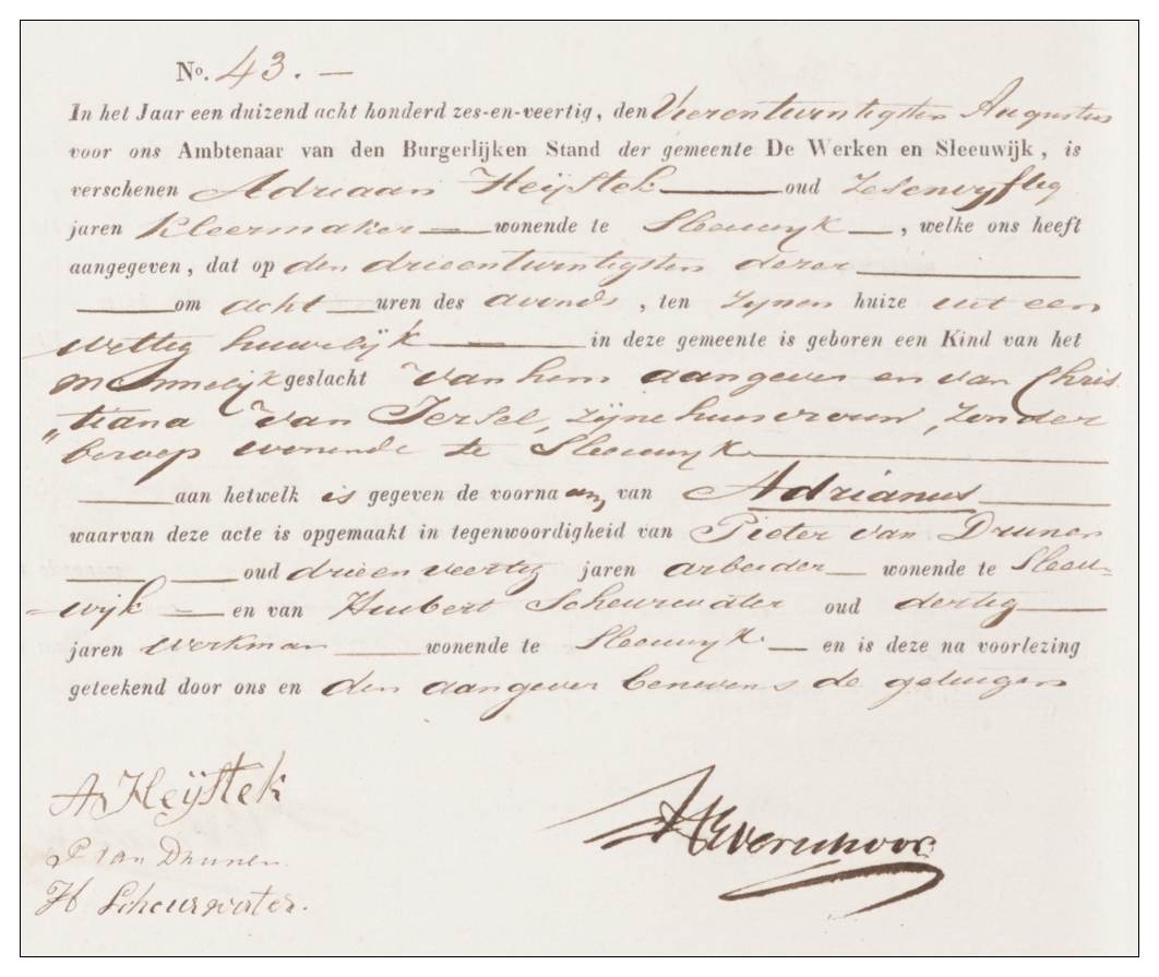 Als achtste kind binnen het gezin Heijstek – Van Iersel werd Adrianus Heijstek op 23 augustus 1846 in Sleeuwijk geboren. Op zijn geboorteakte (nr. 43, Sleeuwijk) staat overduidelijk zijn naam “Adrianus” te lezen. Dit is vermeldenswaardig omdat merkwaardiger wijze en het niet verklaarbaar is, dat jaren later in het Bevolkingsregister van de stad Nijmegen Adrianus werd ingeschreven onder de naam Antonius Adrianus Heijstek.