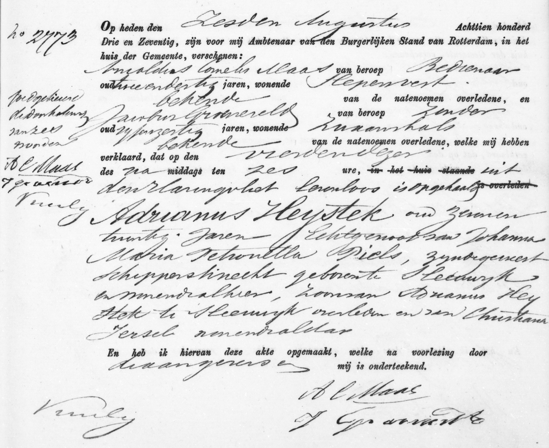Akte van overlijden Adrianus Heijstek; bijna 27 jaar oud.