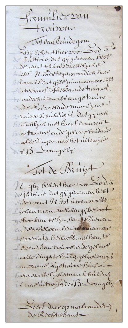 “Geeft daerop malcanderen de rechterhant.” Zo besluit het Delftse “Formulier van trouwen” dat aldaar in 1575 werd gebruikt. Op dat moment was het volstrekt nieuw dat de burgerlijke overheid zich met zoiets persoonlijks als het huwelijk bemoeide. Met enige voorzichtigheid stellen we nu dat het burgerlijk huwelijk in Delft werd uitgevonden!