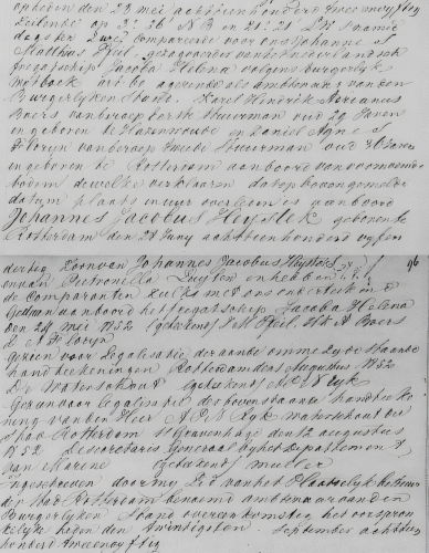 Ik laat U eerst kennismaken met Jan Jacobus Heijstek, gedoopt in Dordrecht op 30 juni 1796. Hij was een zoon van Geertruij Heijstek (Uitwijk 1755 – Dordrecht 1808), de vader was onbekend of zoals de doopakte vermeldde: “onegt kind”.  Door middel van een aantal aktes in de archieven zijn we aardig wat van Jan te weten gekomen, maar niet wanneer hij zich in Rotterdam vestigde. Wel weten we dat Jan heeft gevaren, bij zijn inschrijving in 1817 voor de Nationale Militie in Dordrecht was als beroep vermeld zeeman. In dat jaar 1817 kon men nog geen foto’s maken, doch met de vermelde uiterlijke kenmerken zou men nu een prachtige compositietekening kunnen maken. Een breed aangezicht, brede neus, ronde kin, ronde mond, bruine ogen, een hoog voorhoofd, zware wenkbrauwen, zware bakkenbaarden, enz. Zou het kunnen zijn dat Jan tijdens een verlofperiode in Rotterdam zijn latere vrouw ontmoette