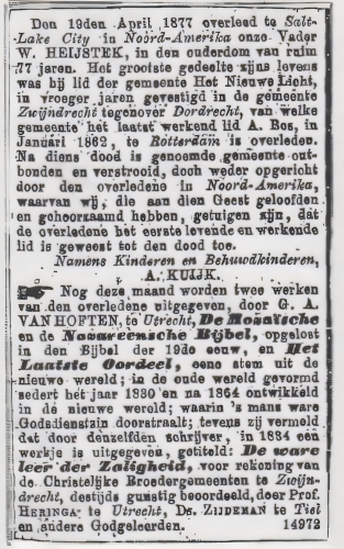 (Geertje volgde met haar man Aart haar ouders naar Salt Lake City. Ook zij waren toegetreden tot de Mormonen hetgeen nogmaals tot uitdrukking kwam in de bij dit artikel geplaatste advertentie die Aart plaatste na het overlijden van zijn schoonvader Willem Heijstek, “…waarvan wij, die aan dien Geest geloofden en gehoorzaamd hebben, getuigen zijn dat de overledene het eerste levende en werkende lid is geweest tot den dood toe”. Over hun verdere leven is de U.S.A. is niet meer bekend dan dat zij voorkwamen in een lijst van 1880 bij een volkstelling in Salt Lake City.)
