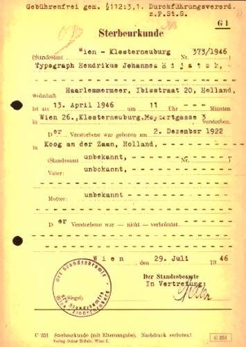 Van Hendricus wist ik slechts dat hij op 13 april 1945 was overleden in Klosterneuburg (Oostenrijk) en ook daar was begraven. Maar hoe kwam hij in Oostenrijk terecht en hoe was hij daar overleden? Daarover gaf het dossier uitsluitsel.