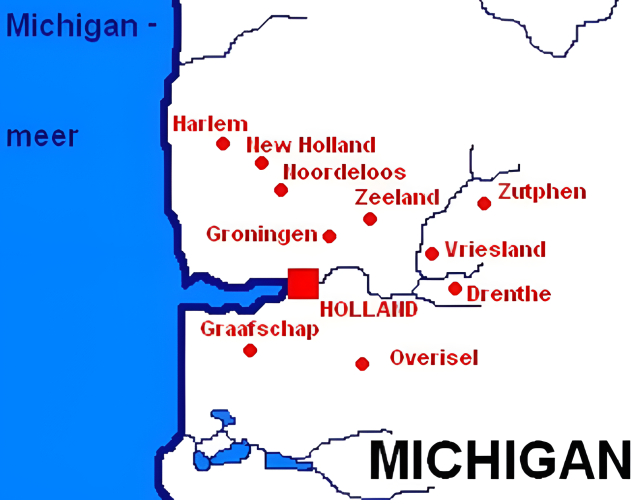 Tot zo ongeveer de helft van de vorige eeuw was emigreren naar een land overzee welhaast een afscheid voor eeuwig van de geboortegrond en van de achterblijvende familie. Het reizen ging, op een enkele uitzondering na, per schip en persoonlijke contacten vonden per brief plaats. Maar toch probeerden de landverhuizers de herinnering aan hun geboortegrond in stand te houden. In bijvoorbeeld de Amerikaanse staat Michigan werden sommige streken bevolkt door grote groepen Nederlandse emigranten en zij gaven hun plaats van vestiging vaak een Nederlandse naam, soms hun vroegere woonplaats. Kijk maar eens op dit kaartje waar rondom de stad Holland zoveel plaatsen liggen met echt Nederlandse plaatsnamen. Dit beeld ziet men niet alleen in Michigan maar op mijn diverse reizen door Amerika zag ik het in meerdere staten. In een artikel uit 2019 op dit weblog vertelde ik al eens van een bezoek dat mijn vrouw en ik brachten aan het in de staat Montana gelegen plaatsje Amsterdam. Een molen, naar Nederlands voorbeeld gebouwde polderhuizen, winkels met typisch Nederlandse producten en toch woonde daar inmiddels de derde en vierde generatie. Men sprak al helemaal geen Nederlands meer maar bleef toch een verwantschap voelen met het land van hun voorouders.
