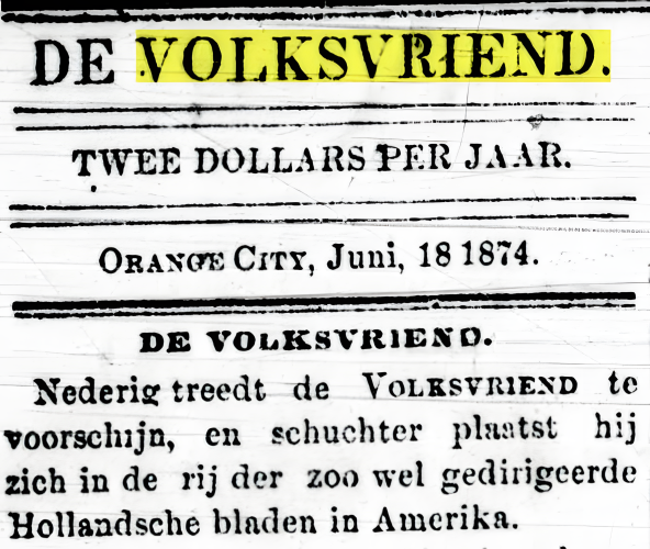 Ook in andere Amerikaanse staten werden soortgelijke kranten uitgegeven. Zo had men tussen 1874 en 1951 in de plaats Orange City in de staat Iowa (waar men nog jaarlijks een tulpenfestival houdt) “DE VOLKSVRIEND”. Het nieuws hierin bleef niet beperkt tot de naaste omgeving want ik las hierin een bericht dat Antonie Heystek en Paulina Anna Hendrikx in december 1906 in Chicago, gelegen in de aangrenzende staat Illinois, hun vijftigjarig huwelijksfeest vierden. Voor de volledigheid: Antonie en Paulina trouwden 18 december 1856 in Nijmegen.