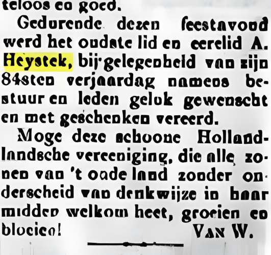 In de niet erg Nederlands klinkende plaatsnaam De Pere, gelegen in de staat Wisconsin, had men de wel Nederlands klinkende krant “DE VOLKSSTEM” en zowaar ook hierin een bericht over Antonie Heystek ter gelegenheid van zijn 84ste verjaardag. Antonie verzette als bibliothecaris veel werk voor de Hollandsche Vereniging in Chicago. Als u de laatste zin van dit bericht leest hiernaast zal het duidelijk zijn welk een belangrijke plaats deze verenigingen innamen in een tijd dat er amper radio was, nauwelijks telefoon en nog helemaal geen televisie.