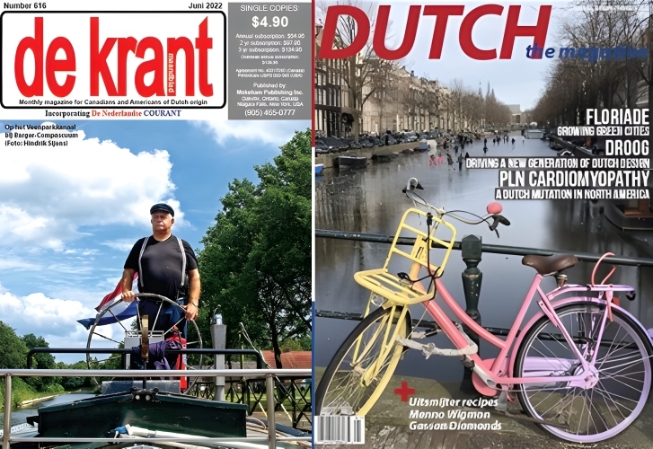 Toch zijn er nog bladen met veel aandacht voor Nederland, maar niet meer alleen in de Nederlandse taal. Zo is er het blad met de Nederlandse naam “DE KRANT”, dat op de cover zich presenteert als “monthly magazine for Canadians and Americans of Dutch origin”. Trouwens hoe Nederlands is de cover met als onderschrift Op het Veenparkkanaal bij Barger-Compascuum”. Ook is er tweemaandelijks magazine “DUTCH” dat zichzelf aanprees als “the only North American magazine in English about the Netherlands. Veelzeggend was een artikel in dit blad Cycling through the Fatherland en een recept voor een uitsmijter.