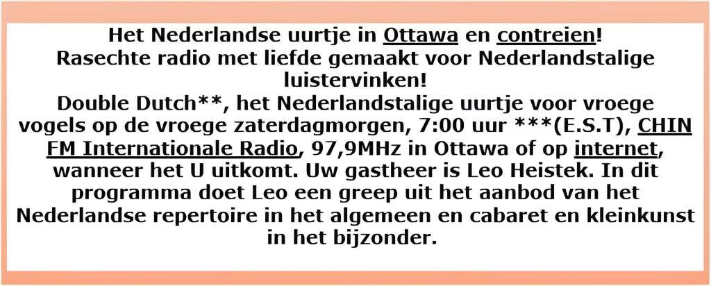 Leo heeft zijn eigen radioprogramma op de vroege zaterdagmorgen en draait Nederlandse muziek die door de Nederlandse kolonie zeer wordt gewaardeerd. De onderstaande aankondiging op Internet spreekt voor zich. Wilt U zelf luisteren: https://www.chinradio.com/dutch